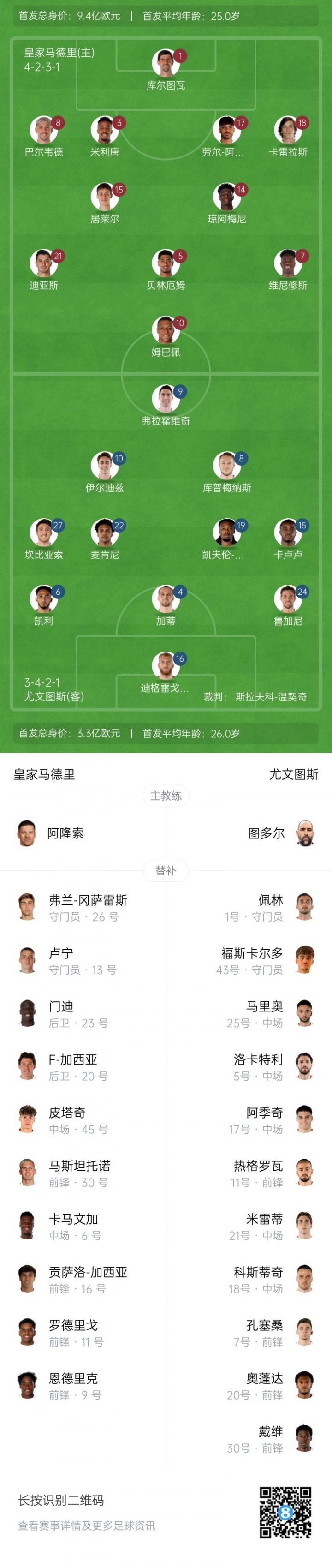 皇马首发:1-库尔图瓦、17-劳尔·阿森西奥、8-巴尔韦德、3-米利唐、18-卡雷拉斯、14-琼阿梅尼、5-贝林厄姆、15-居莱尔、21-迪亚斯、7-维尼修斯、10-姆巴佩